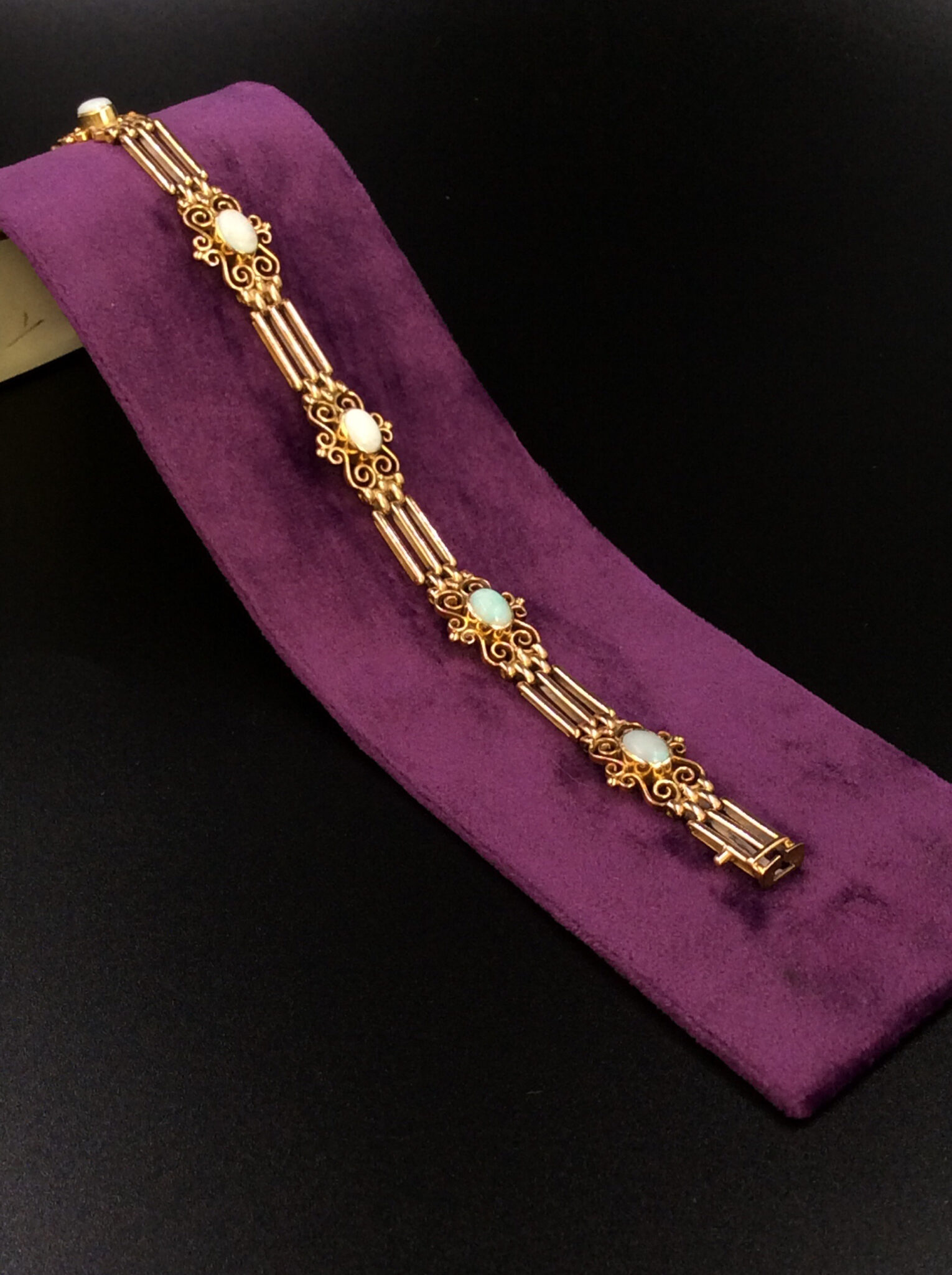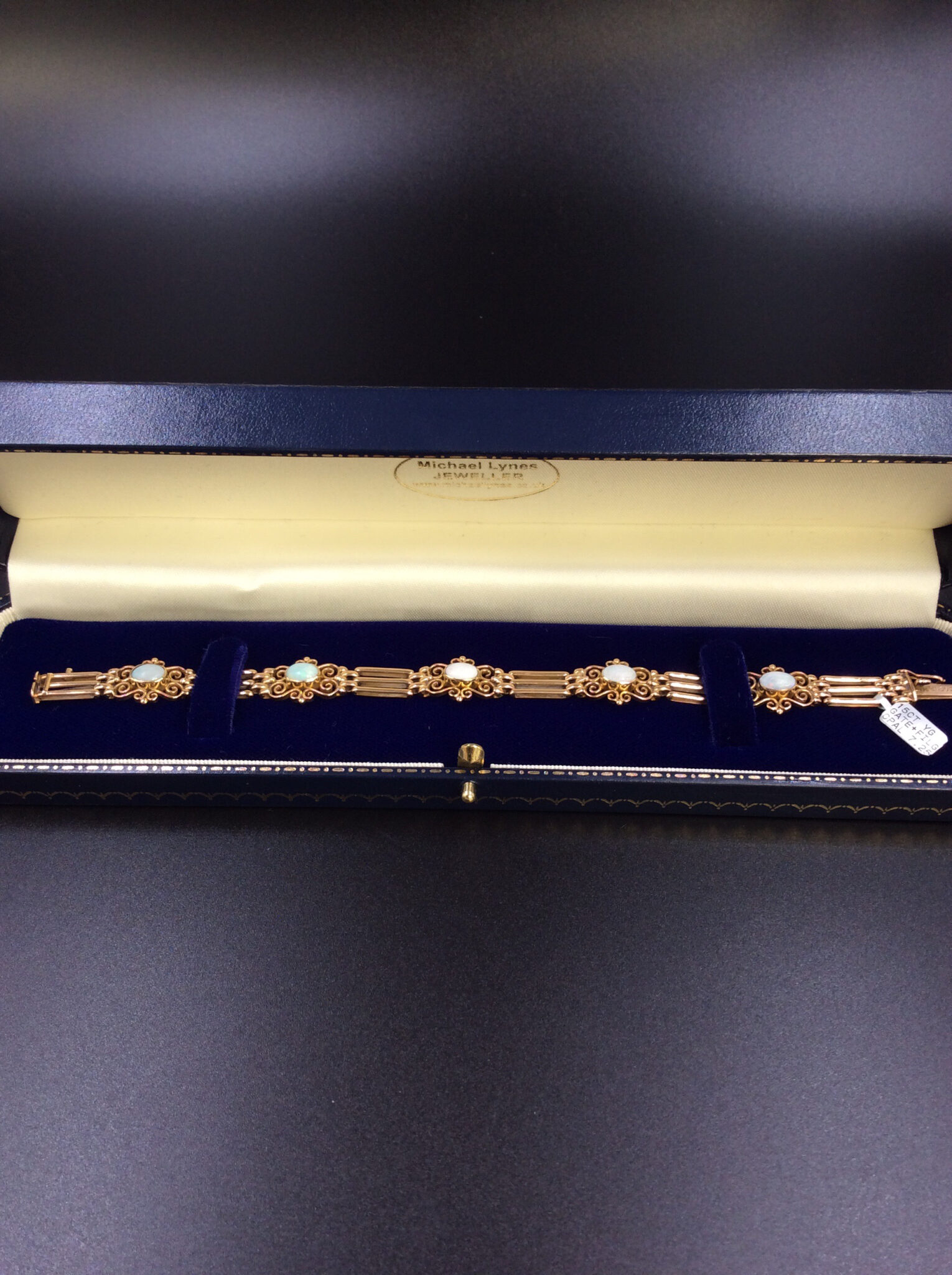 5 filigree centerpieces, topped with rich and firery opals, held together with gate style links make up this 15ct vintage bracelet. It utilises a simple tongue fastener alongside a figure of 8 safety for peace of mind.